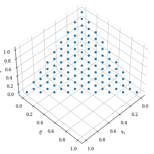 By carefully observing the figure above, one can see that along one axis, exactly 12 partitions (which results in 13 points, including the corners) exist. However, this implies that when the dimensionality increases, more points will be sampled a) on the boundaries and b) on the overall simplex.